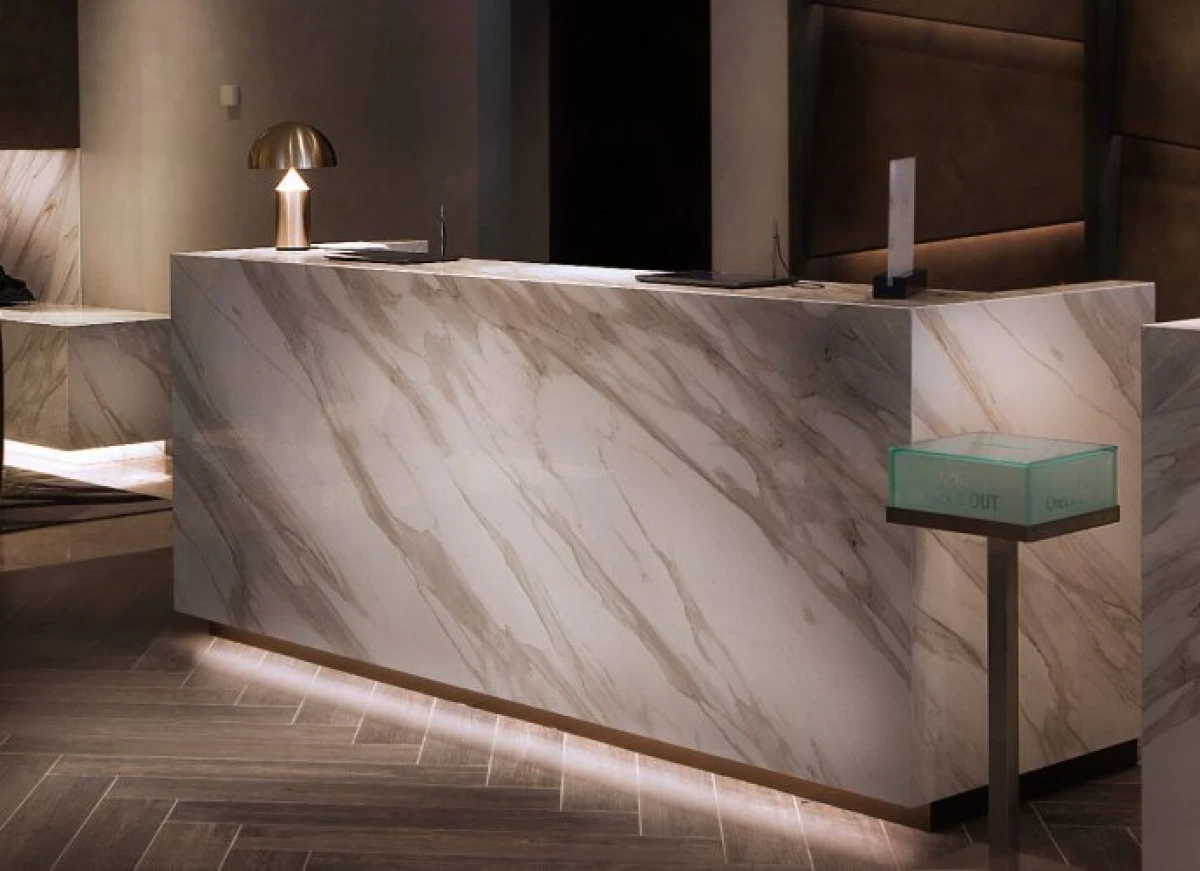 Geniş mermer plakaları ile yapılan uygulamalar, mekânlarda kesintisiz ve estetik bir görünüm oluşturur.